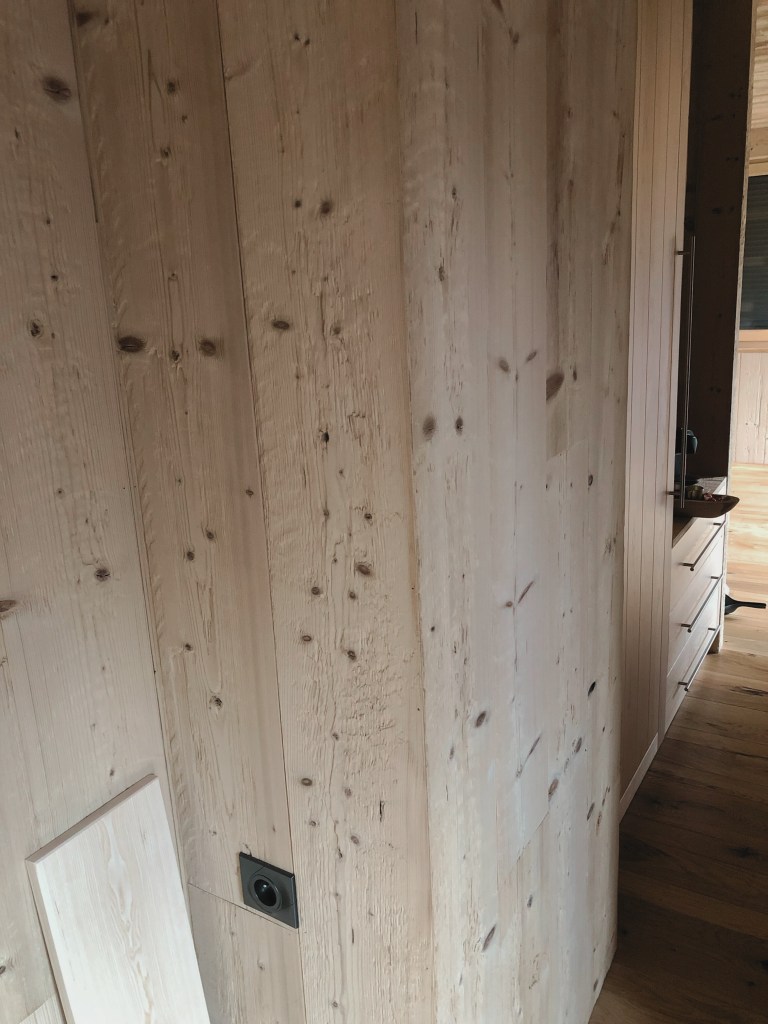 Après la mise en place de lambourdes permettant d’accueillir le bardage et une complète isolation, nous avons sélectionné chez notre fournisseur Machot Bois un épicéa thermo brossé éclaté.